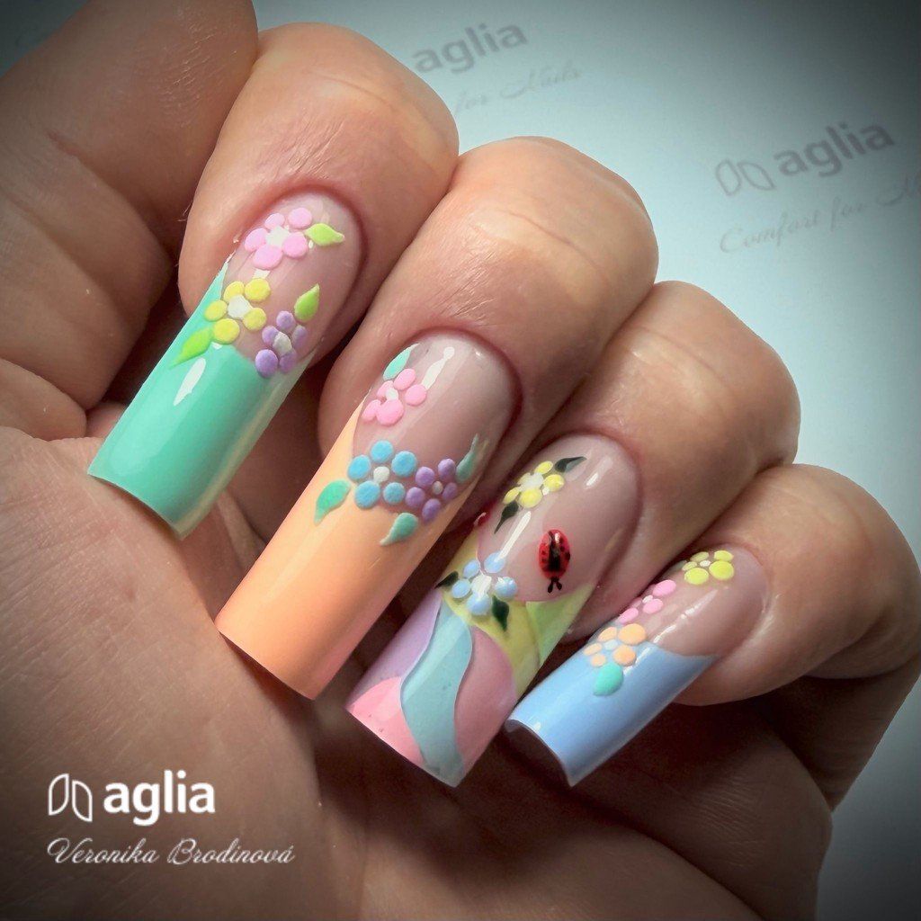 COLOR GEL POLISHES AGLIA stand out for their premium quality, maximum pigmentation, and perfect self-levelling properties. They are ideal for application on reinforced nails using GUMMY BASE, as well as on built nails created with any builder gel or polygel AGLIA.