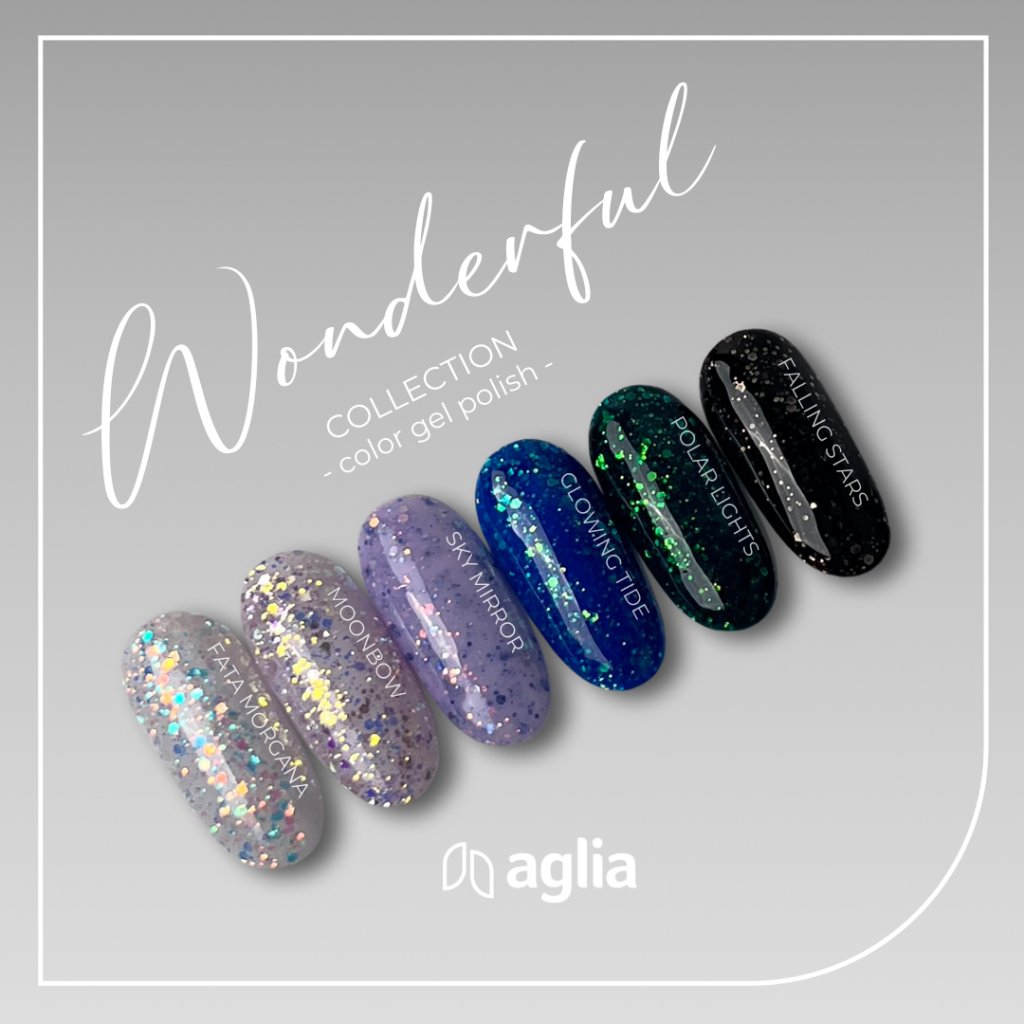 COLOR GEL POLISHES AGLIA stand out for their premium quality, maximum pigmentation, and perfect self-levelling properties. They are ideal for application on reinforced nails using GUMMY BASE, as well as on built nails created with any builder gel or polygel AGLIA.