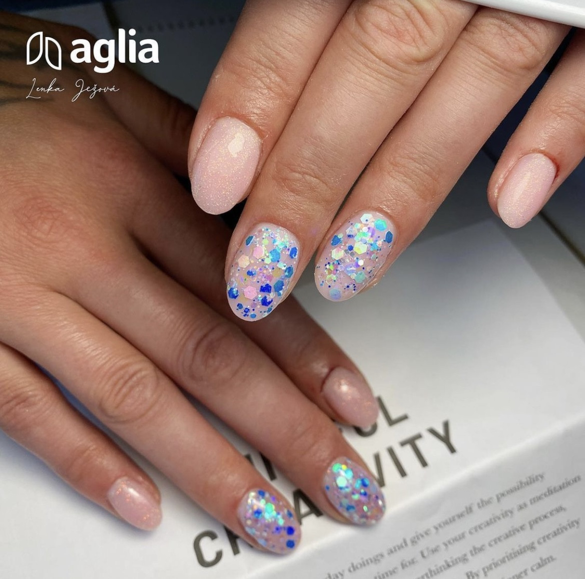 Glitters possiamo applicare nello strato di dispersione di un gel colorato cosí che li applichiamo con dito o con pennello FAN su gel giá indurito e delicatamente li spingiamo contro l´unghia. I residui dall´intorno della unghia spolveriamo attentamente con pennello FAN ed applichiamo sigillante lucido.