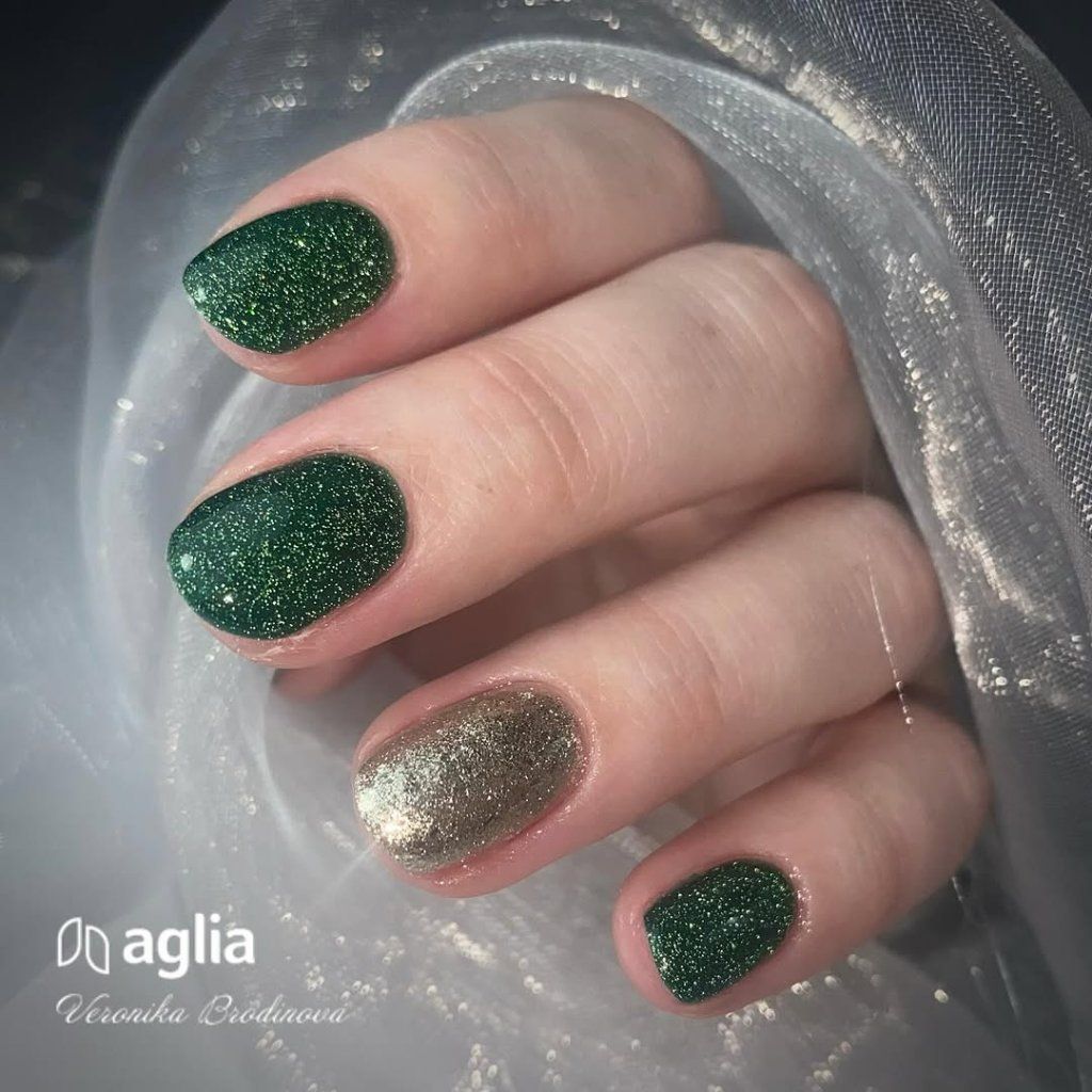 Sötétzöld fényvisszaverő UV zselé körmökhöz finom holografikus csillámokkal, amely mesterséges megvilágításban gyönyörűen érvényesül.