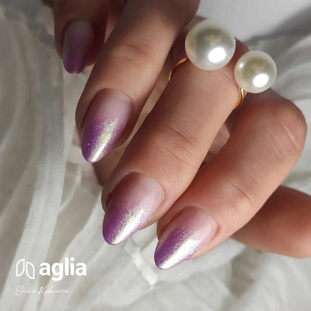 Lila-rózsaszín UV zselé körmökhöz kifejezett arany gyöngyházfénnyel.