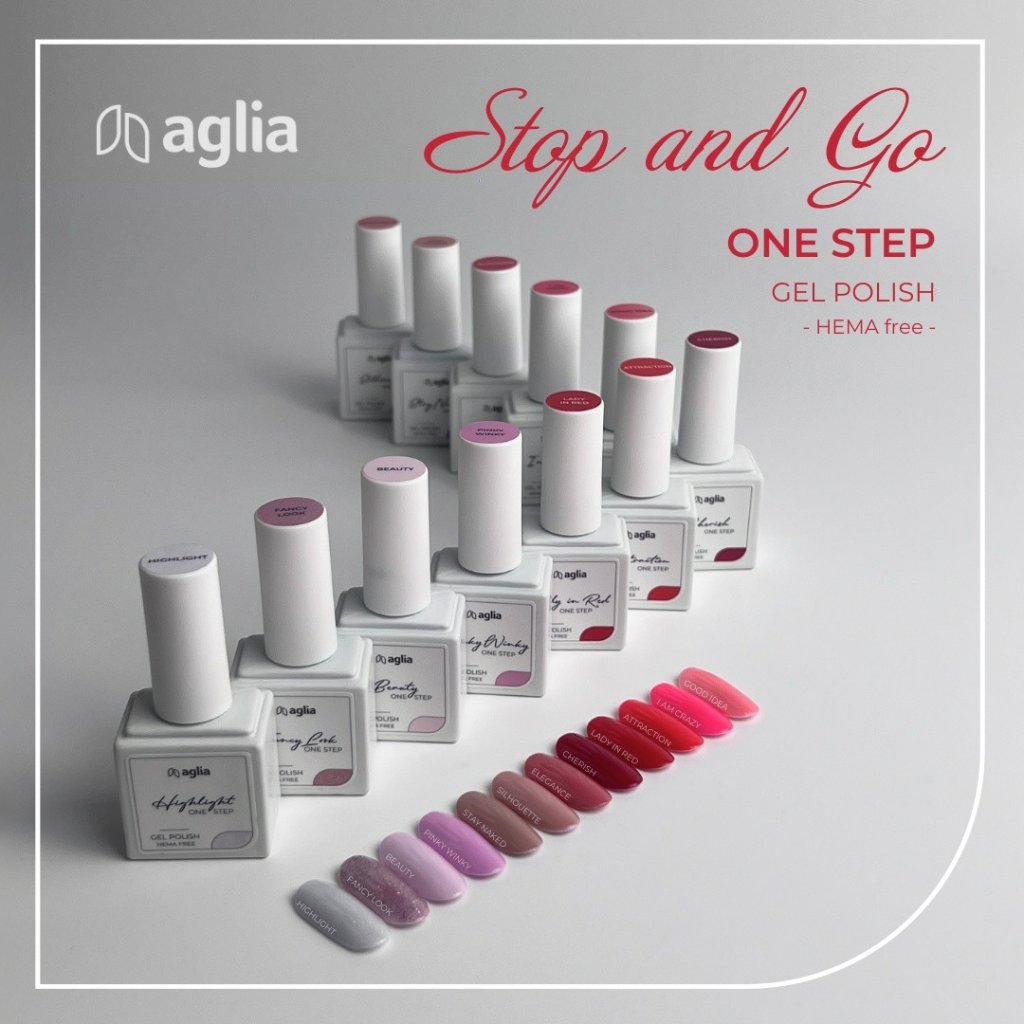 ONE STEP GEL POLISHES AGLIA are the ideal choice for creating a perfect manicure in just a moment. For longer wear, they can also be used on reinforced or built nails. The choice is entirely yours. They are also perfectly suitable for toenail application.