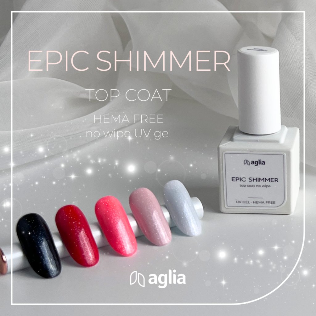 EPIC SHIMMER – a non-wipe top coat with silvery flakes that give nails a subtle shimmering effect. It is exceptionally flexible and durable.